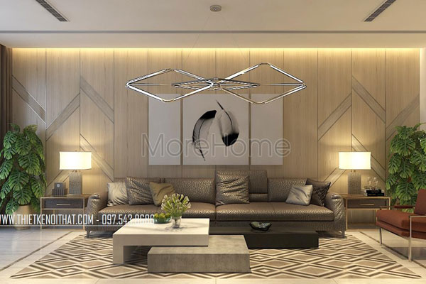 Không gian phòng khách được cho là không gian tối quan trọng của thiet ke noi that biet thu, vì đây không chỉ là không gian gia đình mà còn là không gian đón tiếp khách, thể hiện sự tôn trọng với những người thân bạn bè khi tới thăm nhà. KTS Morehome lựa chọn thiết kế hiện đại với tông nâu trầm cùng những sắc thái khác của màu nâu đề tạo nên không gian 3D huyền bí hơn. Lựa chọn bộ sofa da màu tối hoa văn vằn vệt có xu hướng khá tiệm với bức tường đối diện tạo nên vẻ sang trọng khó kiếm.