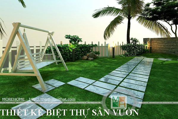 Với mẫu thiết kế này, Morehome lựa chọn cây Osaka vàng và cây hoa bụi kèm theo chọn ghế đu cho gia chủ. Lối đi sử dụng các mảnh đá có hình dáng đôi chút tùy hứng để dẫn lối cho người tới tham quan biệt thự.