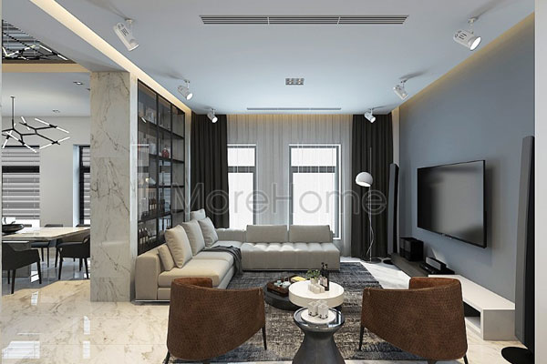 Phòng khách biệt thự hiện đại Vinhomes Central Park được thiết kế đậm phong cách sống châu âu với bộ sofa góc chữ L bọc da hiện đại, chiếc bàn trà thấp giống như điểm nhấn nhẹ nhàng vô cùng phù hợp với bộ sofa phòng khách này vậy. Phá cách hơn với điểm nhấn hai chiếc ghế sofa màu nâu sáng. Phần vách tivi được trang trí bằng chất liệu giấy dán tường Hàn Quốc màu trung tính cao cấp. Kệ tivi biệt thự màu trắng hiện đại được sử dụng để đồ trang trí, loa đài và những cuốn tạp trí kinh tế, thời trang, nhà đất, chứng khoán…Phía sau bộ sofa góc chữ L là tủ kính đồ trang trí. Morehome sử dụng đèn chiếu sáng dạng đèn chiếu góc để làm tăng thêm vẻ đẹp sang trọng đẳng cấp ở từng đường nét đồ nội thất phòng khách biệt thự hiện đại Vinhomes Central Park này.