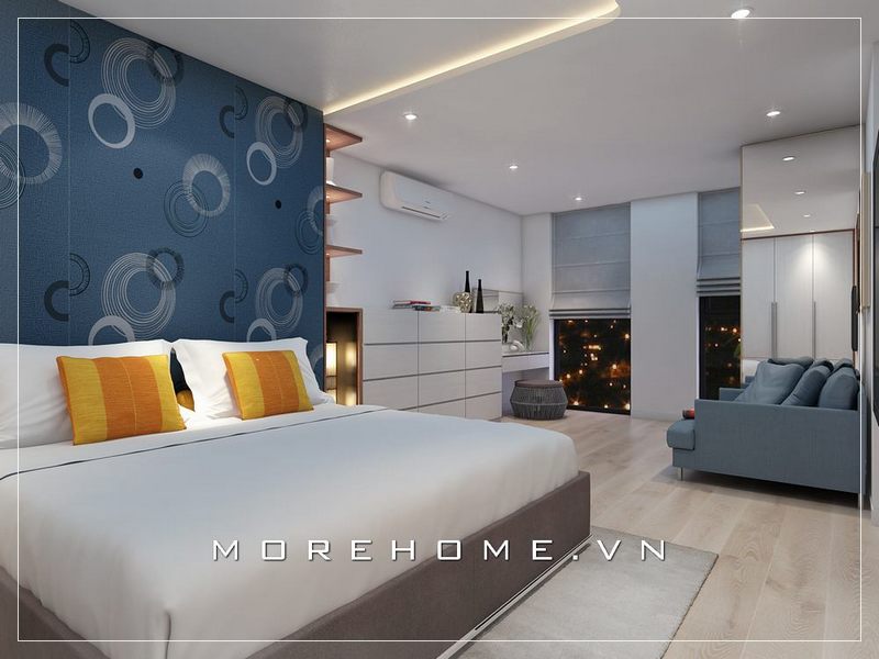 Ngoài ra, việc lựa chọn gam màu sáng cho tường và nội thất cũng giúp mở rộng cảm giác không gian. Những tông màu nhẹ nhàng như trắng, xanh nhạt hoặc beige không chỉ tạo sự dễ chịu mà còn phản ánh ánh sáng tốt hơn, làm cho căn phòng trở nên rực rỡ hơn. Kết hợp với các gương lớn để phản chiếu ánh sáng và tạo chiều sâu cũng là một thủ thuật thông minh, giúp phòng ngủ nhỏ trở nên sang trọng và ấm cúng hơn. Việc này không chỉ mang lại và tạo không khí thư giãn, còn giúp tối ưu hóa không gian lưu trữ với những chi tiết thiết kế tinh tế mà vẫn đảm bảo phong cách lịch lãm cho căn phòng.